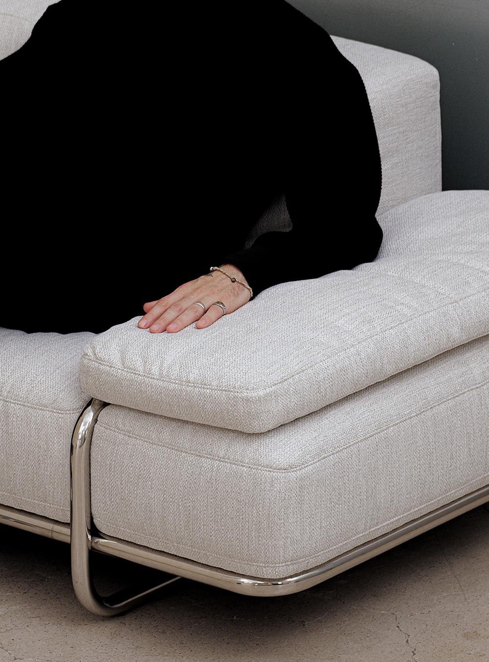 • A daybed•style sofa with a thin seat cushion supported by panel legs, giving it a slightly floating appearance.